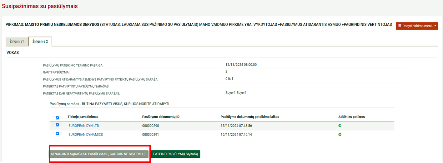 - Tada pasirenkama užduotis ,,Susipažinti su pasiūlymais" ir spaudžiamas mygtukas "Atnaujinti sąrašą su pasiūlymais, gautais ne sistemoje".